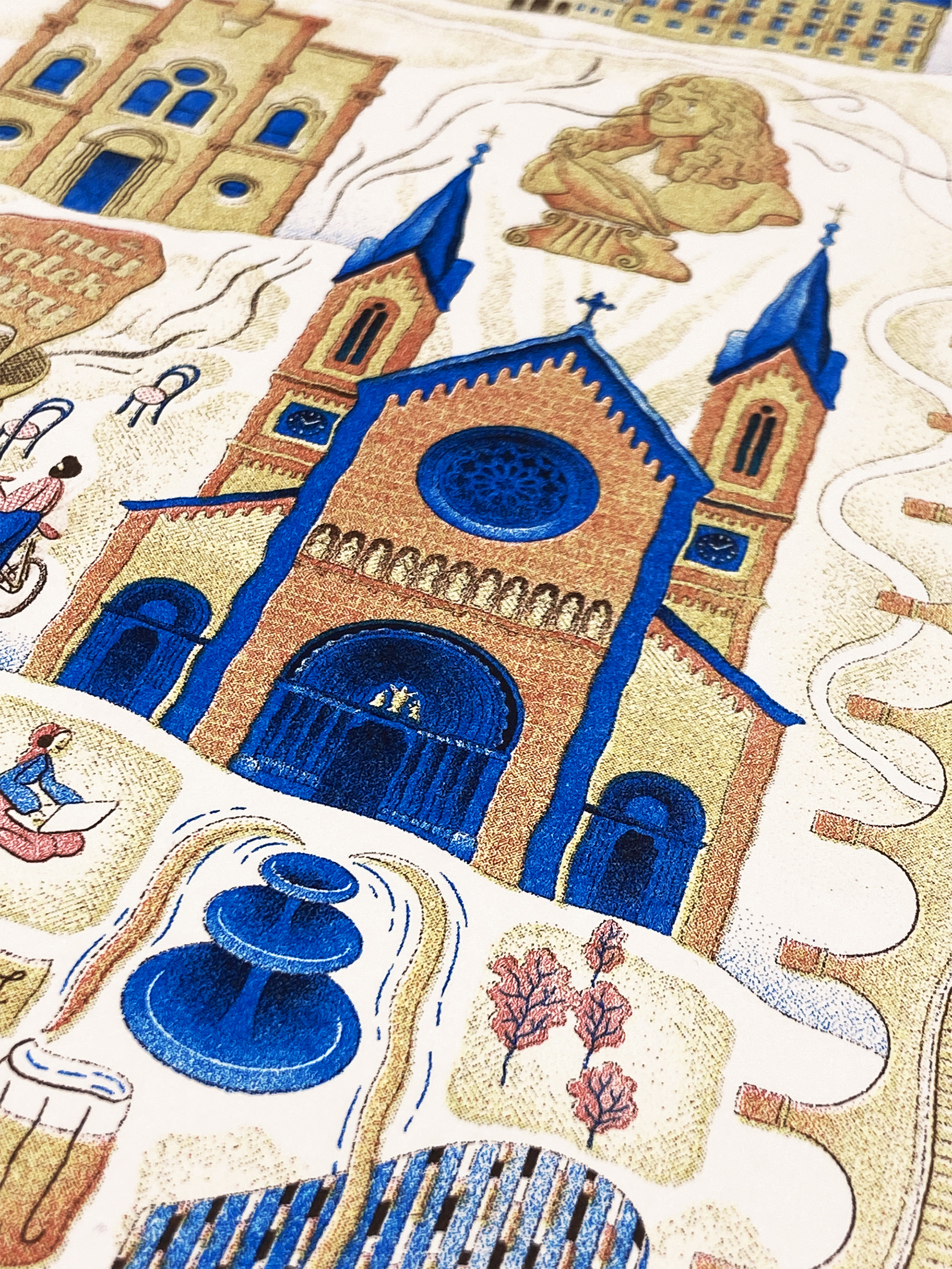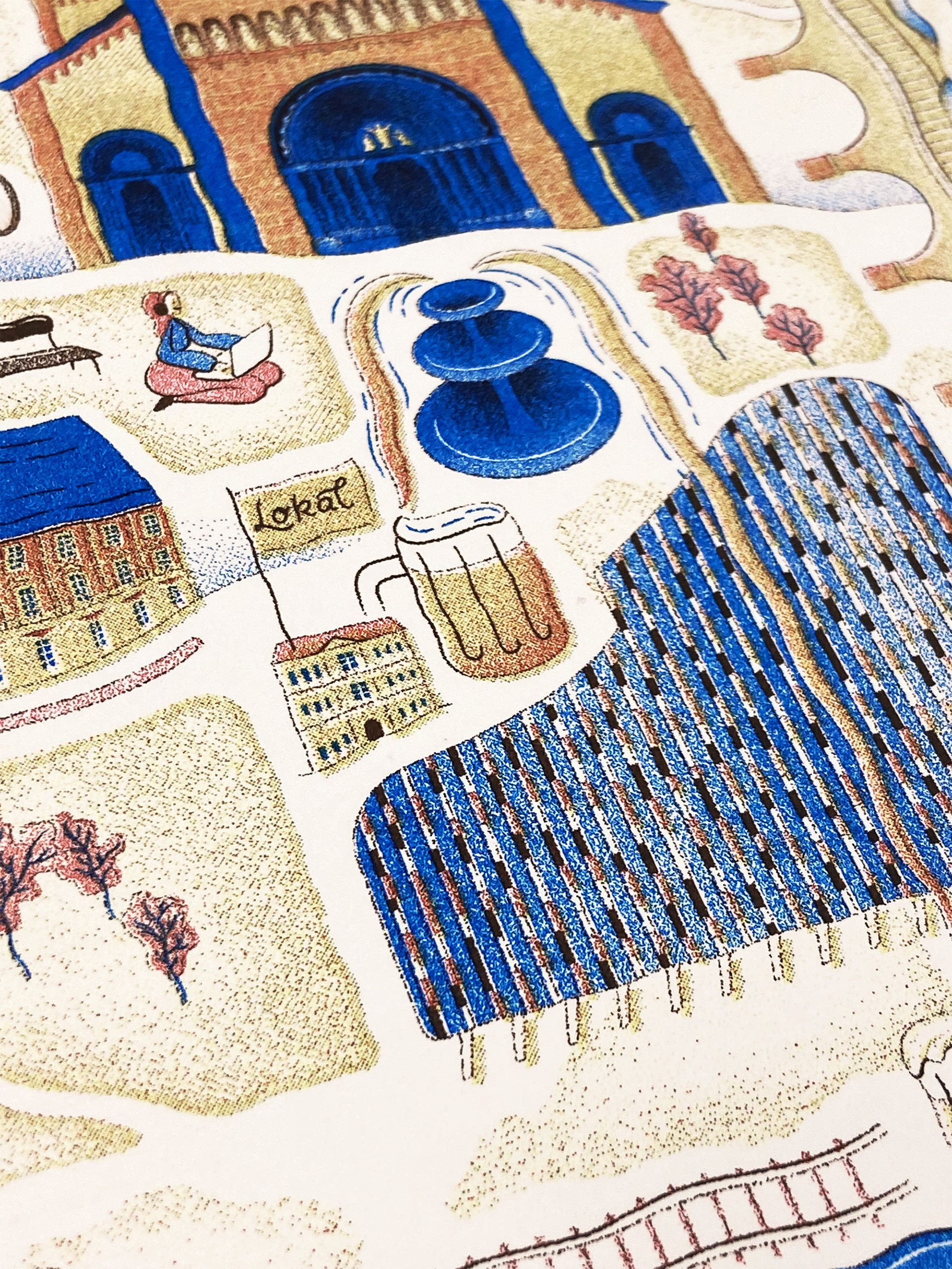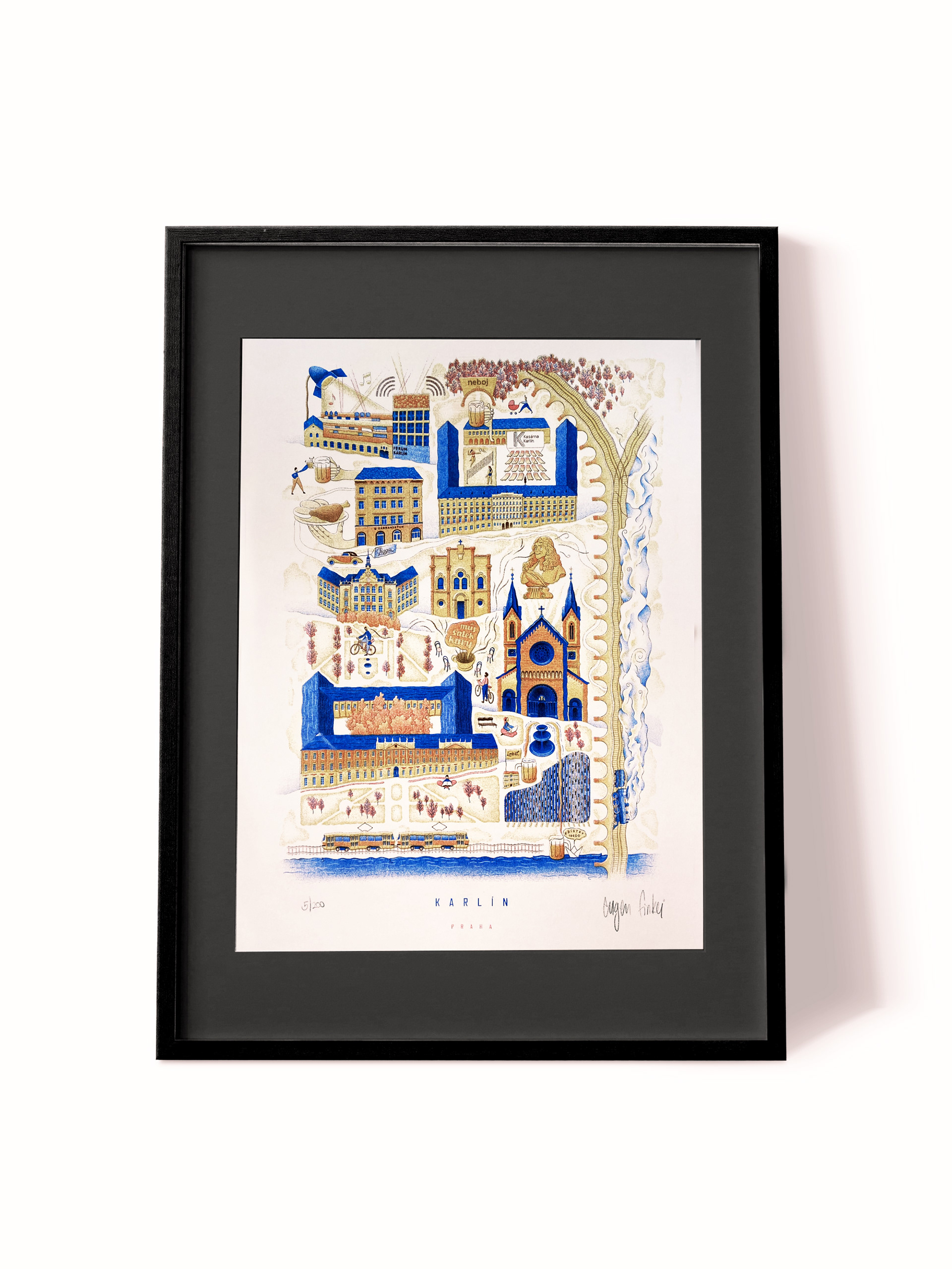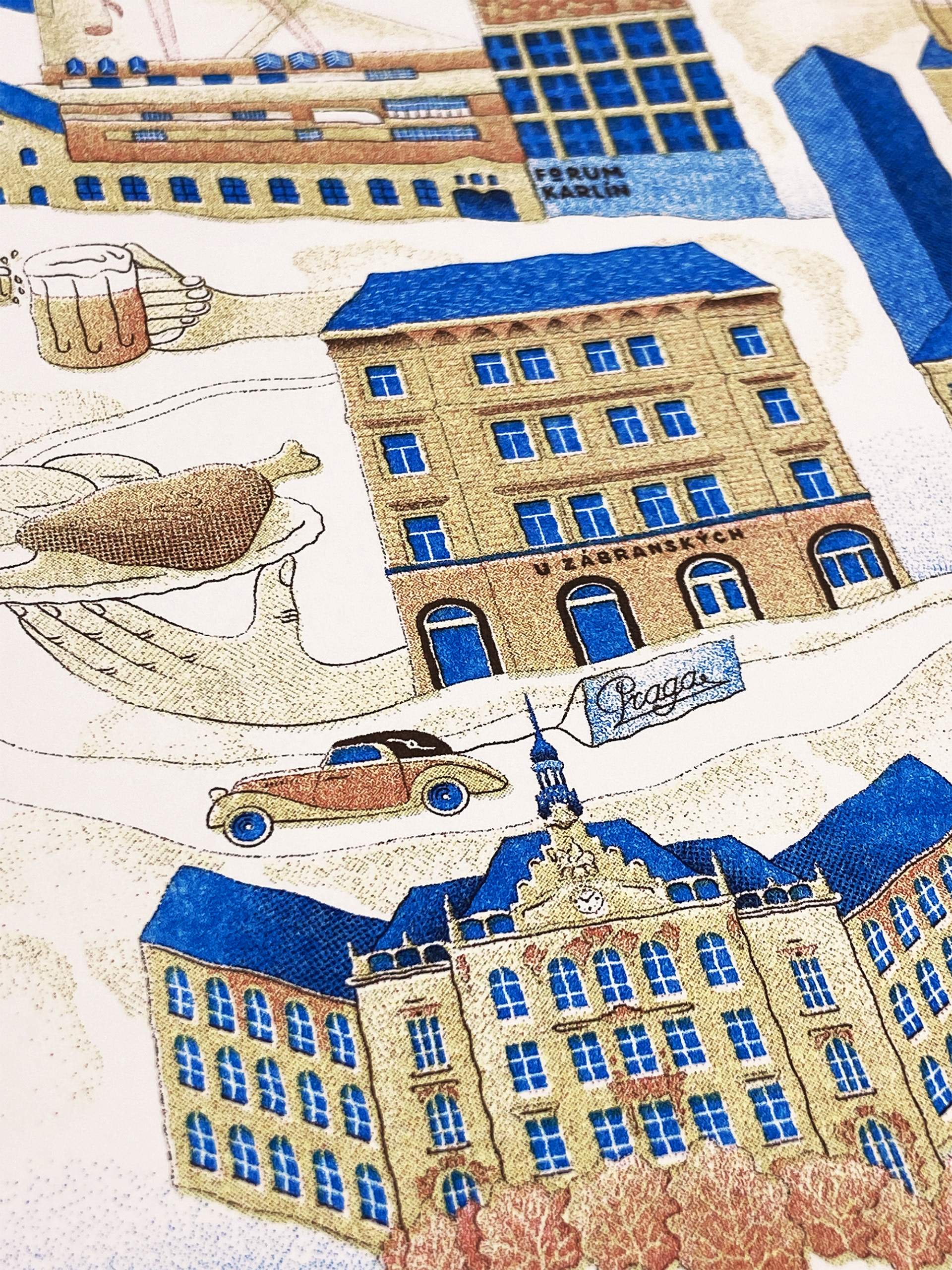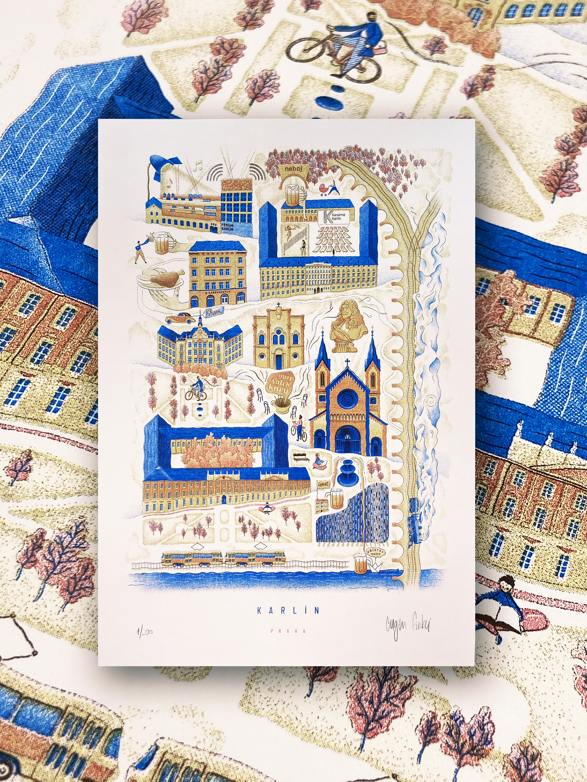 project creating a four colour risograph print. the picture shows the most interesting buildings and sights of Prague's Karlín District.